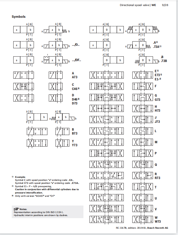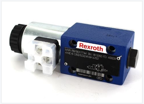 Das Schaltbild des Hydrauliksystems ist üblicherweise auf dem Ventilkörper des Magnetventils angebracht. Anhand des obigen Schaltbilds lässt sich das Umkehrventil mit seinen verschiedenen Stellungen und Kanälen identifizieren. Zum Beispiel: REXROTH Wegeventile der Serie 4WEKunden können die Symbole auf dem Typenschild finden: