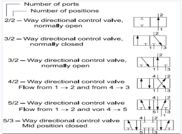Zwei-Wege- (links, rechts) und Drei-Wege-Ventile (links, rechts, Mitte) sind bei hydraulischen Umkehrventilen am gebräuchlichsten. Die Ölflussrichtung ändert sich in jeder Betriebsstellung. Mehrere Ölleitungen sind an das Ventil angeschlossen; gängige Ausführungen sind Zwei-, Drei-, Vier- und Fünfwegeventile. Mehrere Quadrate repräsentieren mehrere Ventile, und mehrere Ölanschlüsse repräsentieren ebenfalls mehrere Ventile, die zusammen als Ventile bezeichnet werden. Beispiele hierfür sind ein Zweiwege-Zweiwegeventil und ein Dreiwege-Vierwegeventil. Im Diagramm sind mehrere „Quadrate“ durch vertikale Linien voneinander getrennt, wobei einige nur wenige Ziffern enthalten. An jedem Quadrat schneiden sich mehrere vertikale Linien, die die Anzahl der Durchgänge angeben. Die Pfeile zeigen den Durchfluss an: Ein Pfeil kennzeichnet ein Zweiwegeventil (Öleinlass und Ölauslass), zwei Pfeile ein Vierwegeventil. Der Schnittpunkt von ┴ und ┬ mit dem Kasten zeigt an, dass der Durchgang durch den Ventileinsatz blockiert ist. Befinden sich zwei Pfeile und ein ┬ in einem Kasten im Bild, bedeutet dies, dass fünf Glieder blockiert sind und eines davon ebenfalls blockiert ist.