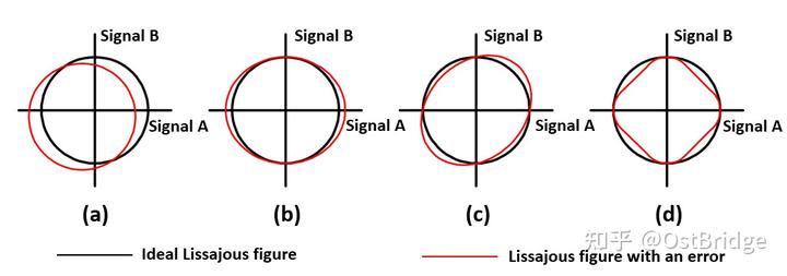 Die Qualität und Genauigkeit des Encoders lassen sich bequem beobachten und verfolgen, indem man das simulierte Encodersignal auf der X- und Y-Achse des Oszilloskops darstellt. In der Praxis wird das Encodersignal jedoch durch Fertigungs-, Montage- und optische Abtastfehler sowie durch Umwelteinflüsse verzerrt. Diese Signalverzerrung führt zu einem Signal-Dispersions-Effekt (SDE), der sich in jedem Zyklus des Encodergitters wiederholt. Die Änderung des Signalhintergrundpegels (UA_o_off, UB_o_off) wird üblicherweise durch Defekte oder Verunreinigungen auf der Messskala des Encoders verursacht. Diese Verzerrung führt zu einer Abweichung um die Lissajous-Kurve (siehe Abbildung 2a). Die inkonsistente Amplitude (UA, UB) zwischen den Signalspitzen A und B kann auf eine ungleichmäßige oder inkonsistente Ausleuchtung des Fotodetektors zurückzuführen sein. Abbildung 2c zeigt, dass eine Phasenverschiebung von 90° eine Änderung der Kurve bewirkt. Hauptursache für diesen Fehler ist die Neigung zwischen der Abdeckung des Abtastgitters und der Hauptmessskala. Alle durch Optoelektronik und Elektronik verursachten höheren Harmonischen führen dazu, dass das Signal keine perfekte Sinuswelle mehr ist. Dieser Fehler erzeugt eine nicht-kreisförmige Lissajous-Kurve, wie in Abbildung 2d dargestellt.