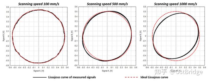 Zunächst überprüften wir die Leistung des Testlinien-Encoders bei verschiedenen Geschwindigkeiten. Der Encoder-Lieferant gab eine maximale Verfahrgeschwindigkeit von 100, 500 und 1000 mm/s an. Abbildung 5 zeigt die Lissajous-Kurven für mehrere Signalzyklen bei 100, 500 und 1000 mm/s.
