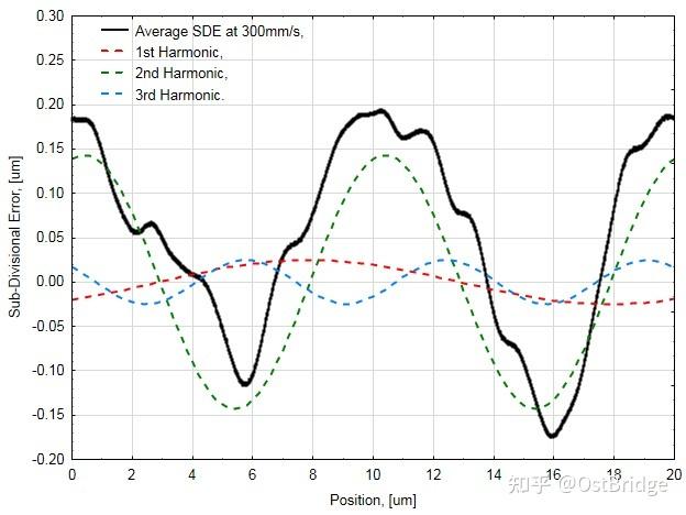 Die FFT-Analyse zeigt, dass die erste, zweite und dritte Harmonische den größten Einfluss auf die Fehleramplitude haben. Daher werden alle drei ersten Harmonischen im selben Diagramm dargestellt, um den Einfluss jeder einzelnen Harmonischen zu verdeutlichen. Die Gesamtfehleramplitude beträgt ± 0.185 µm. Die zweite Harmonische, die zweimal pro Zyklus auftritt, erzeugt den maximalen Fehlerwert.
