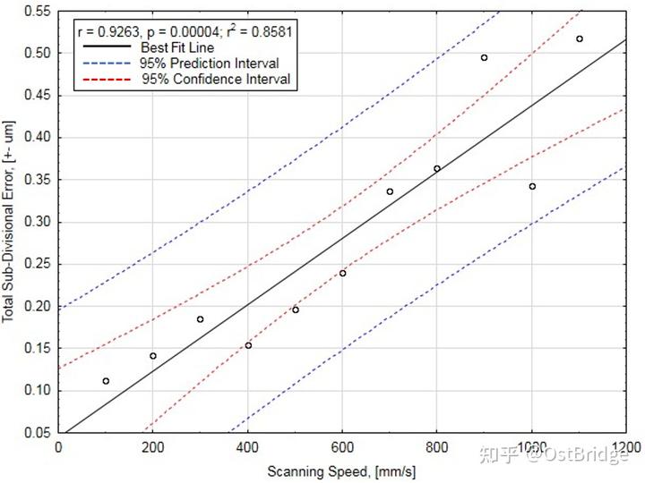 Die Ergebnisse zeigen einen starken linearen Zusammenhang zwischen Abtastgeschwindigkeit und Gesamtfehler. Mehr als 85 % des experimentell ermittelten Fehlers lassen sich mathematisch auf die kontinuierlich steigende Encodergeschwindigkeit zurückführen (R² = 0.8581). Der größte Fehler beträgt ± 0.52 µm bei 1100 mm/s, und es besteht ein signifikanter Unterschied im linearen Zusammenhang zwischen den Fehlern bei 900 mm/s und 1000 mm/s.
