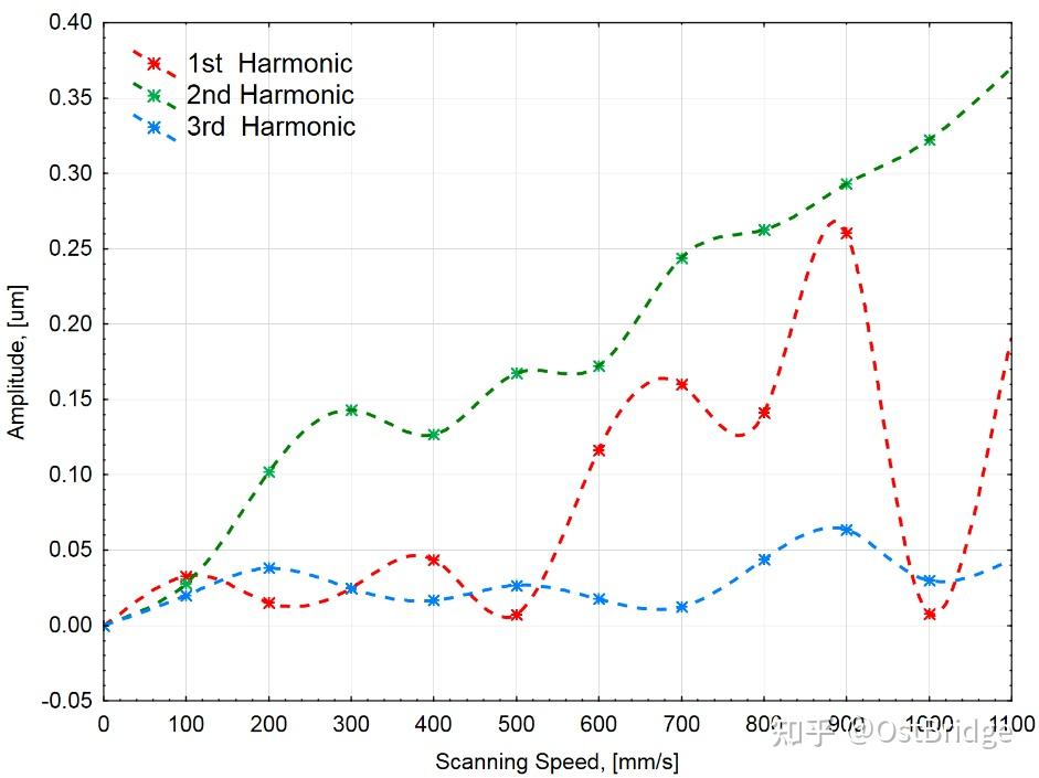 Die Bedeutungsänderung der dritten Harmonischen ist im Vergleich zu den anderen nicht signifikant. Ihre Amplitude erreicht einen Maximalwert von 0.06 µm. Dieser Wert wurde, wie auch bei der ersten Harmonischen, bei einer Abtastgeschwindigkeit von 900 Millimetern pro Sekunde beobachtet. Üblicherweise entsteht diese dritte Harmonische durch Veränderungen während des optischen Abtastvorgangs.