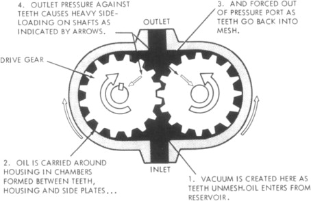 Das Funktionsprinzip der Zahnradpumpe ist in der Abbildung dargestellt. Sie besteht aus drei Teilen: dem Pumpendeckel 4 und 8 sowie dem Pumpengehäuse 7. Das Pumpengehäuse 7 ist mit zwei gleich großen Zahnrädern ausgestattet, deren Breite und Eingriffsfläche eng beieinander liegen. Das Zahnrad 6, die beiden Zahnräder, die beiden Endkappen und das Pumpengehäuse bilden eine Dichtungskammer. Diese ist durch die Zahnkopfkante und die Eingriffslinie der Zahnräder in zwei Bereiche unterteilt: die Ölsaugkammer und die Öldruckkammer. Die beiden Zahnräder sind jeweils auf der Antriebswelle 12 und der Abtriebswelle 15 mittels Nadellagern mit Passfedern befestigt. Die Antriebswelle wird vom Motor angetrieben.