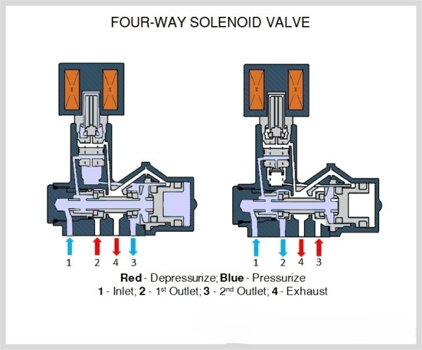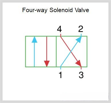 Vierwege-Magnetventile verfügen über vier Anschlüsse: einen Einlass (Druckanschluss), zwei Auslass- oder Betätigungsanschlüsse und einen Auslassanschluss.