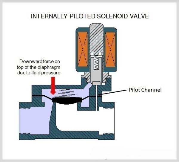Für Anwendungen mit hohem Durchfluss und hohem Druck werden intern gesteuerte Magnetventile eingesetzt. Bei diesem Ventiltyp öffnet oder schließt der Druck über dem Ventil dieses. Dazu ist eine Drossel oder eine Ausgleichsbohrung eingebaut. Üblicherweise blockiert der Ventilkern den Durchfluss an der Drossel. Im geschlossenen Zustand strömt das Fluid durch die Drossel, und der Druck baut sich beidseitig der Membran auf. Solange der Fluidstrom blockiert ist, entsteht durch die größere effektive Fläche auf der Membran eine Absperrkraft. Beim Öffnen des Ventils öffnet der Ventilkern die Drossel, und der Druck auf der Membran entweicht. Der Leitungsdruck öffnet dann das Ventil.