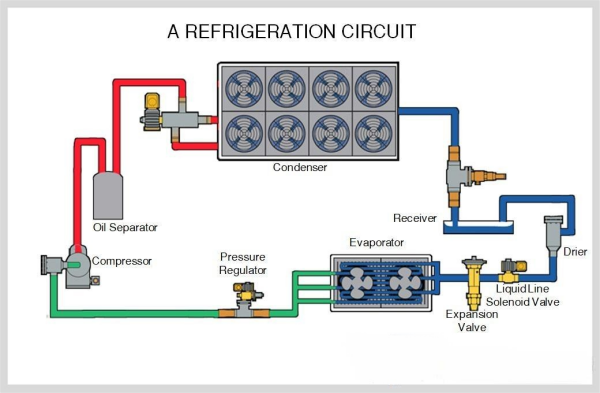 Pneumatische und hydraulische KreisläufeMagnetventile dienen dazu, die Zufuhr von Luft oder Flüssigkeit (üblicherweise Öl oder Kältemittel) in einem Kreislauf zu steuern. Typische Anwendungsgebiete sind Kälteanlagen, Druckluftsysteme und Schmiersysteme. Ein Beispiel für einen Kältemittelkreislauf ist unten dargestellt.