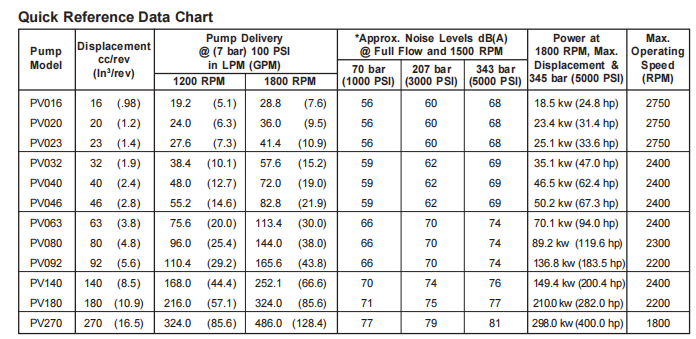 PV-Pumpengrößen, Baureihen 16–270 (als Referenz):