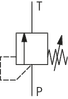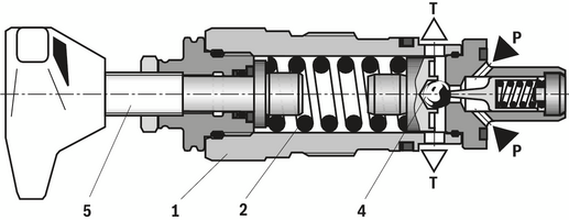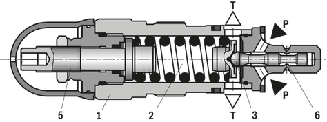 Die Ventile bestehen im Wesentlichen aus einer Hülse (1), einer Feder (2), einem Ventilkegel mit Dämpfungskolben (3) (Druckbereich 25 bar … 400 bar) oder einer Kugel (4) (Druckbereich 630 bar) und einem Einstellmechanismus (5). Der Systemdruck lässt sich stufenlos über den Einstellmechanismus (5) einstellen. Die Feder (2) drückt den Ventilkegel (3) oder die Kugel (4) auf den Ventilsitz. Kanal P ist mit dem System verbunden. Der im System herrschende Druck wirkt auf die Oberfläche des Ventilkegels (bzw. der Kugel). Überschreitet der Druck in Kanal P den an der Feder (2) eingestellten Wert, öffnet sich der Ventilkegel (3) oder die Kugel (4) gegen die Feder (2). Nun fließt Hydraulikflüssigkeit aus Kanal P in Kanal T. Der Hub des Ventilkegels (3) wird durch die Prägung (6) begrenzt.